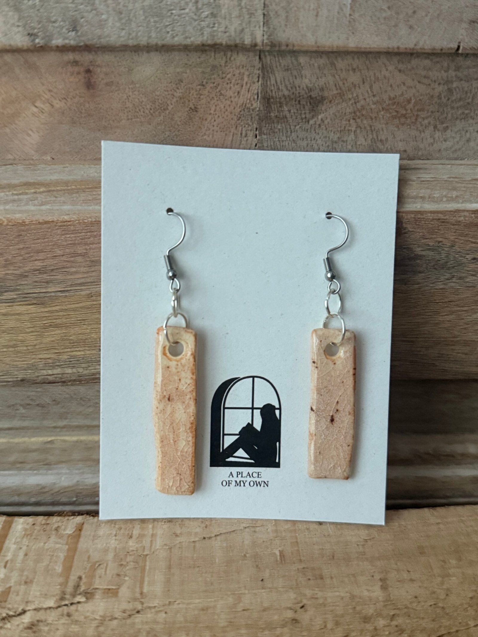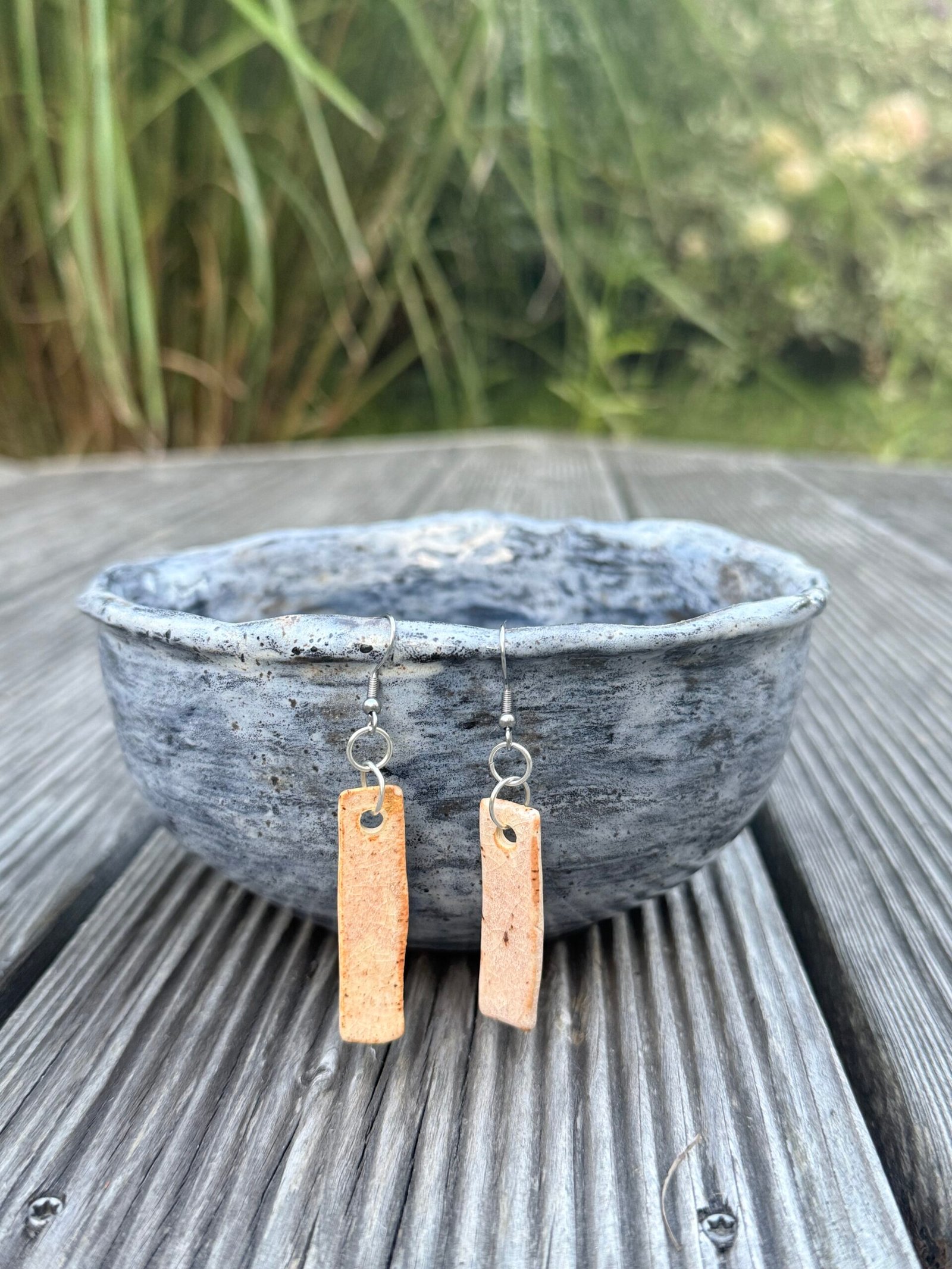 These asymmetric earrings are made in a little cosy place of my own 🙂 I carefully shaped them using the slab building technique—a process that lends each piece its one-of-a-kind character. They are fired twice in a ceramic kiln. The glazing adds depth and texture, combining earthy tones and smooth, glossy finishes with crackle effect to create wearable art. The clay body is glazed on both front and back.